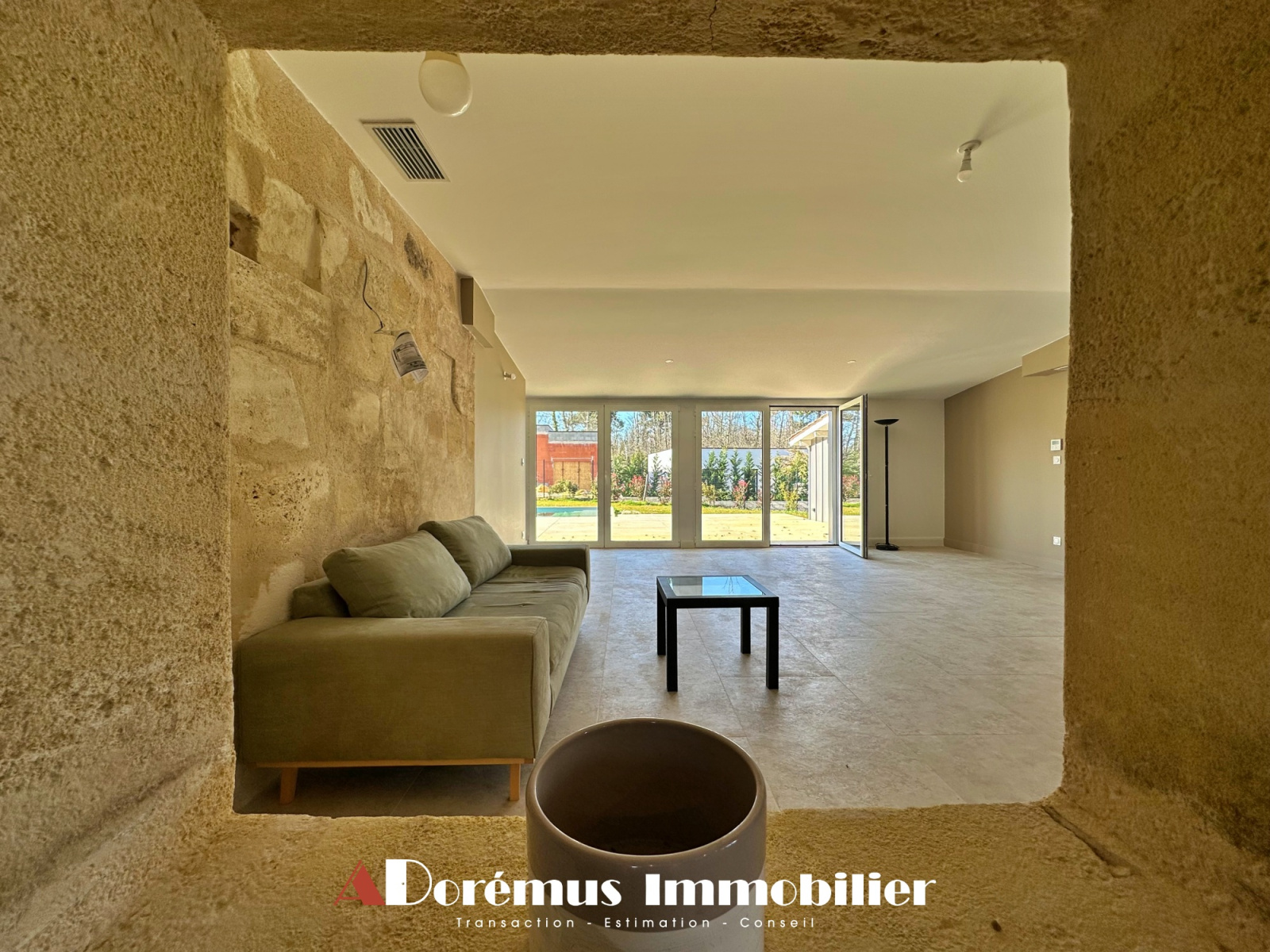 DORÉMUS IMMOBILIER vous présente cette superbe villa en pierre entièrement rénovée, sublimée par un agrandissement contemporain aux lignes épurées.